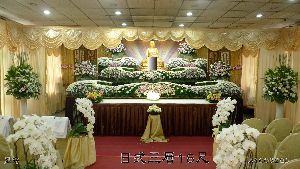 ![]() 檢視放大圖 龍毅精緻日式造型鮮花山18~20呎日式鮮花山、外牌(刻字)內三樣花、燈光、椅套、佛幡六對、造型淨水 | ![]() 檢視放大圖 禮堂外牌佈置殯儀館告別式禮廳外牌刻字及布幔全圍 |